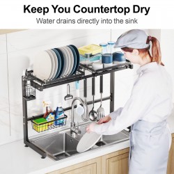 GSlife Over The Sink Dish Drying Rack - Adjustable (26.3"-35") Dish Rack Over Sink with Dual Bars, 3 Baskets, Hooks, Cutlury Holder, Large Dish Drainer Drying Rack for Kitchen Organization, Black